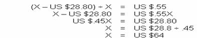 The CMR equals unit contribution margin UCM) divided by unit selling price. The UCM equals the unit selling price minus unit variable cost. The original unit selling price was US $60 $9,000,000 revenue 150,000 units), and the original unit variable cost was US $27 [ $1,800,000 + $720,000 + $1,080,000 + $450,000) + 150,000 units]. The original CPr1R was therefore US $.55 [ $60 - $27) + $60]. The new unit variable cost was calculated as US $28.80. Accordingly the unit selling price X) is US $64.