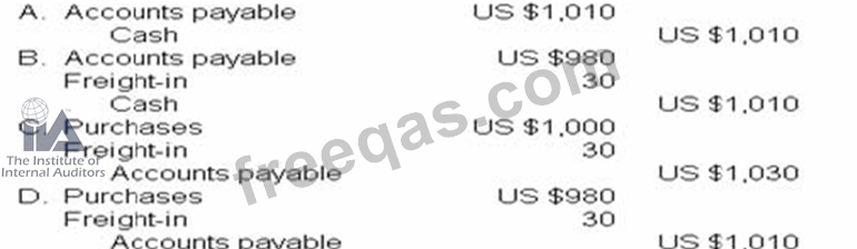 An entity purchased US $1 .000 gross amount of inventory on account with terms of 2 f discount if paid within 10 days. The seller was responsible for delivery to the shipping point, with freight of US $30 prepaid by the seller. The entity records purchases at the net amount. The journal entry to record payment 8 days after the invoice date is: