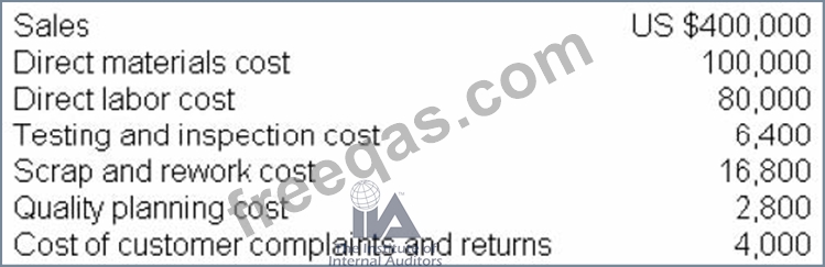 Quality cost indices are often used to measure and analyze the cost of maintaining or improving the level of quality. Such indices are computed by dividing the total cost of quality over a given period by some measure of activity during that period (for example, sales dollars). The following cost data are available for a company for the month of March. The company's quality cost index is calculated using total cost of quality divided by sales dollars.