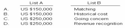 Bandit Co. will report a value of, List A, for the parking and storage facility if it prepares financial reports consistent with the, List B, principle.