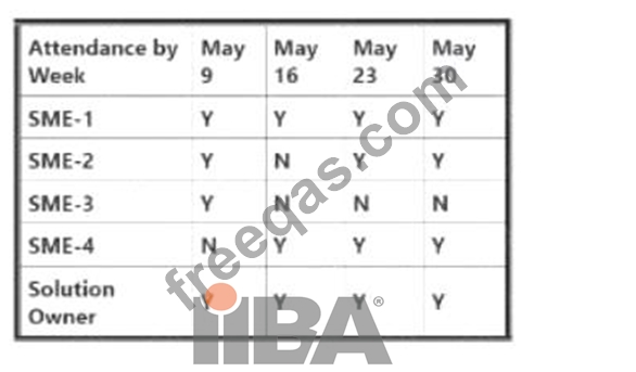 The following chart represents attendance of subject matter experts (SME) and the solution owner for a requirements review and approval meeting held weekly by a business analyst (BA).