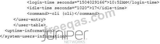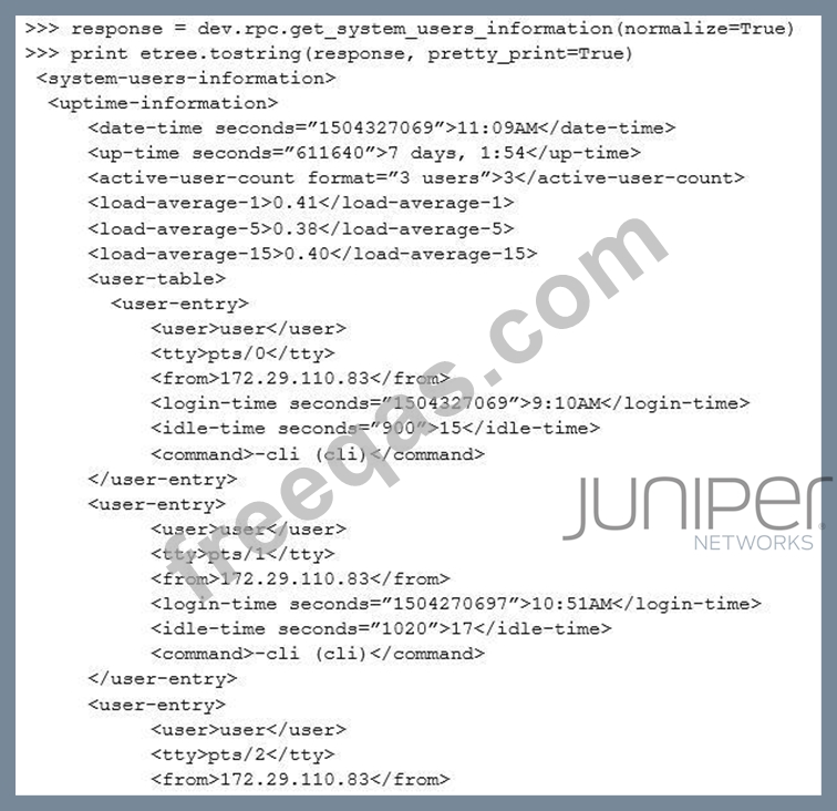 Referring to the exhibit, which Python statement selects the <user-entry> element for the user logged in on the pts/2 TTY?