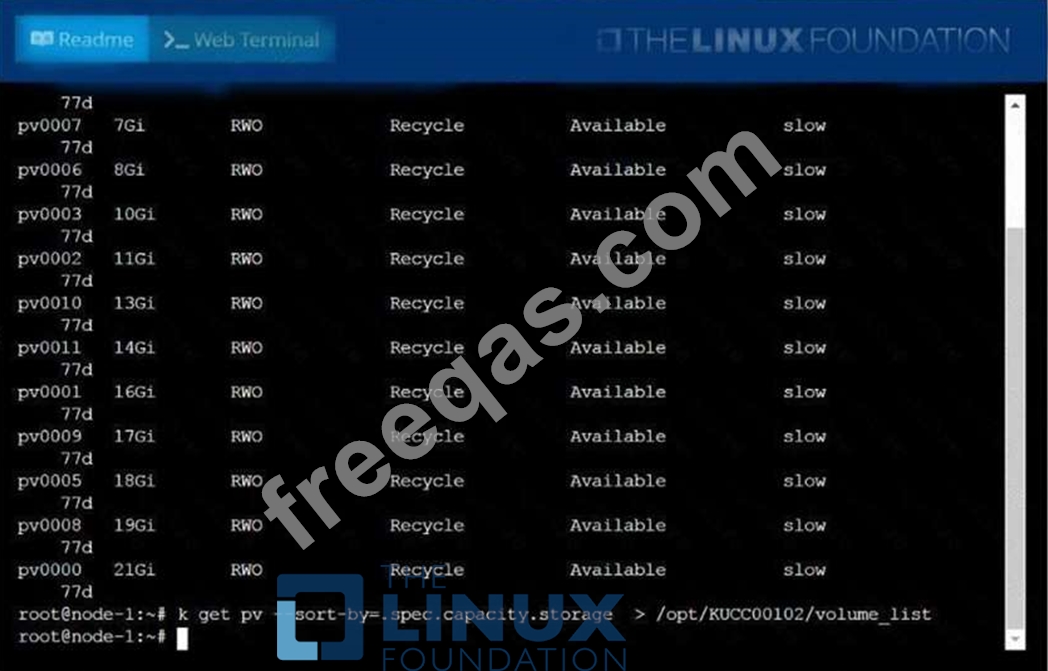 /opt/KUCC00102/volume_list. Use kubectl 's own functionality for sorting the output, and do not manipulate it any further.