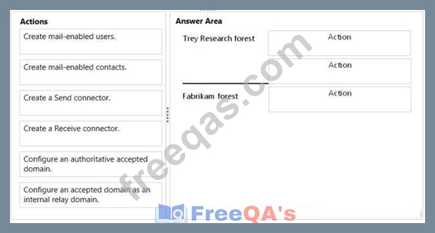 You need to recommend a solution for the Trey Research forest and the Fabrikam forest to share the SMTP domain name of treyresearch.com.