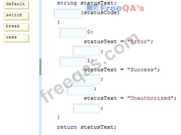 You are adding a method to an existing application. The method uses an integer named statusCode as an input parameter and returns the status code as a string.