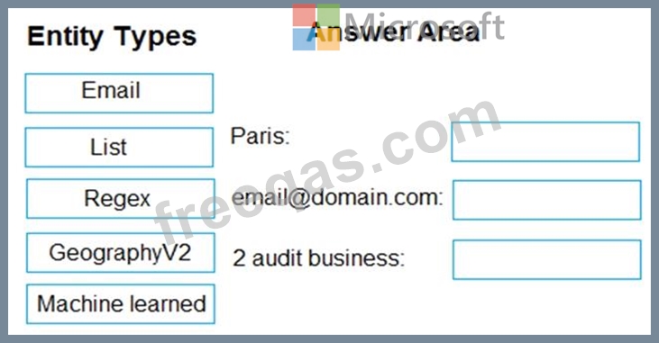 Which entity type should you use for each label? To answer, drag the appropriate entity types to the correct labels. Each entity type may be used once, more than once, or not at all.
