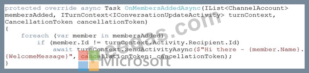 You are building a chatbot for a Microsoft Teams channel by using the Microsoft Bot Framework SDK. The chatbot will use the following code.