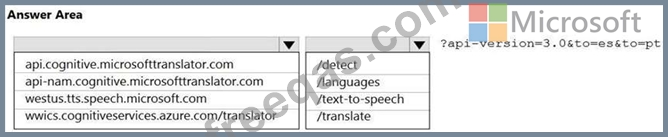 Explanation: Box 1: api.cognitive.microsofttranslator.com Translator 3.0: Translate. Send a POST request to: https://api.cognitive.microsofttranslator.com/translate?api-version=3.0 Box 2: /translate Reference: https://docs.microsoft.com/en-us/azure/cognitive-services/translator/reference/v3-0-translate