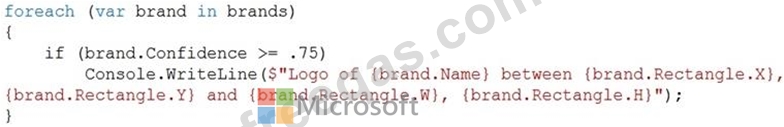 You develop a test method to verify the results retrieved from a call to the Computer Vision API. The call is used to analyze the existence of company logos in images. The call returns a collection of brands named brands.