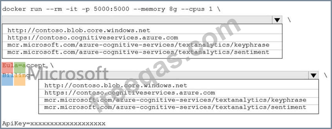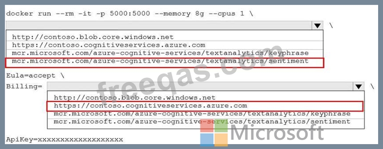 You configure https://contoso.cognitiveservices.azure.com as the endpoint URI for the service, and you pull the latest version of the Text Analytics Sentiment Analysis container.