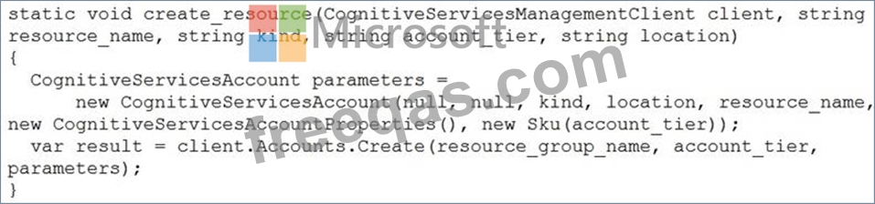 You have the following C# method for creating Azure Cognitive Services resources programmatically.