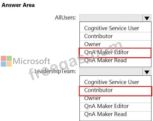 Which role should you assign to AllUsers and LeadershipTeam? To answer, select the appropriate options in the answer area.