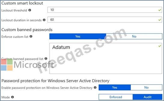 You configure the Authentication methods - Password Protection settings for adatum.com as shown in the following exhibit.