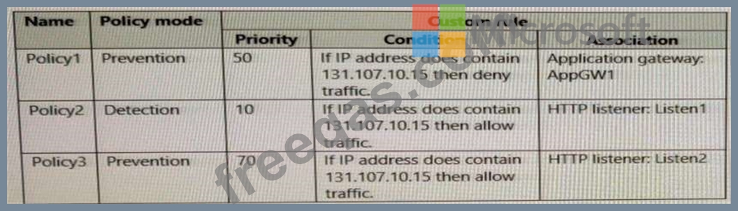You create Azure Web Application Firewall (WAF) policies for AppGW1 as shown in the following table.