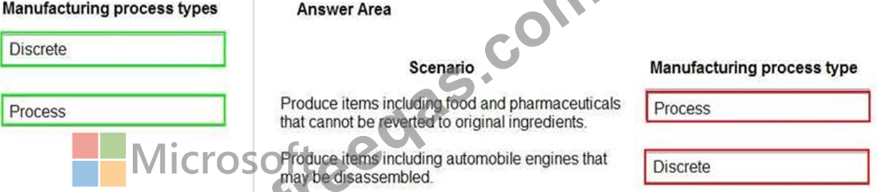 What should you recommend? To answer, drag the appropriate manufacturing process types to the correct scenarios. Each manufacturing process type may be used once, more than once, or not at all. You may need to drag the split bar between panes or scroll to view content.