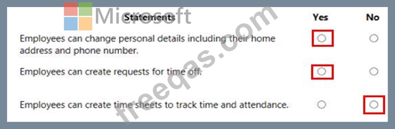 A company wants to understand the self-service capabilities of Dynamics 365 Human Resources. Instructions: For each of the following statements, select Yes if the statement is true. Otherwise, select No.