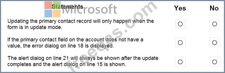 This code is properly registered to the OnChange event of the telephone1 field on an account entity form. The main operation is to update the primary contact's phone number when the account phone number changes. The primary contact field is a lookup. (Line numbers are included for reference only.)
