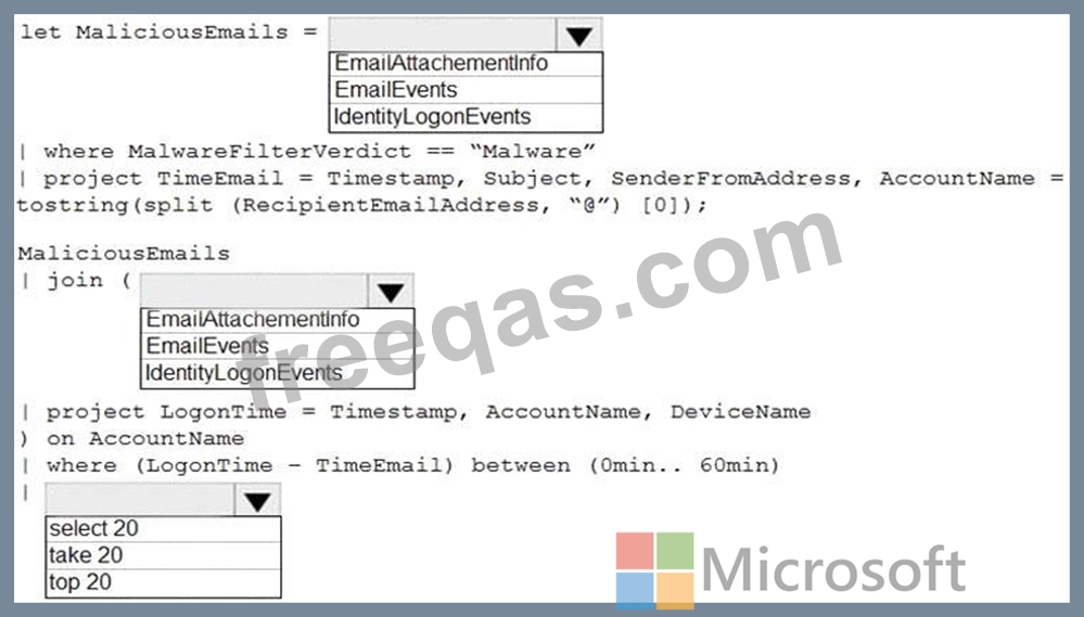 You need to create an advanced hunting query in Microsoft 365 Defender to identify whether the accounts of the email recipients were compromised. The query must return the most recent 20 sign-ins performed by the recipients within an hour of receiving the known malicious email.