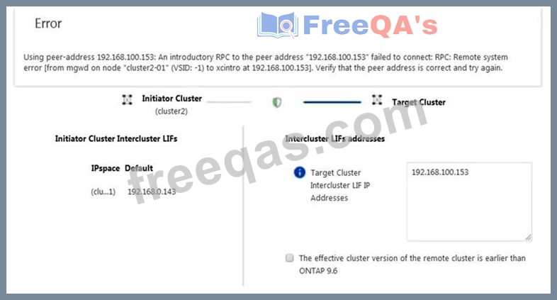Cluster2 intercluster LIFIP: 192.168.0.143 Subnet: 255.255.255.0 Port: e0e passphrase: netapp1234 Cluster1 intercluster LIF IP: 192.168.0.153 Subnet: 255.255.255.0 Port: e0e passphrase: netapp1234 Referring to the exhibit, which statement is correct?
