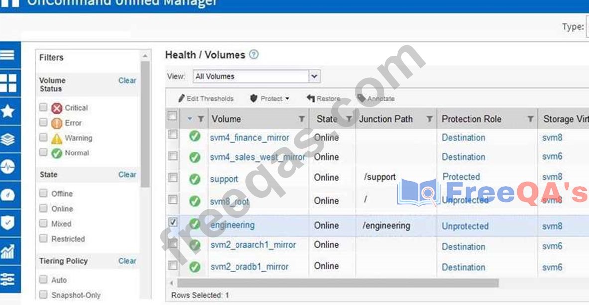 You want to restore a file from the engineering volume that is shown in the exhibit. When you click Restore in OnCommand UnifiedManager, there are no files available to restore.