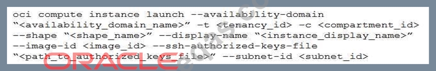 You are using the Oracle Cloud Infrastructure Command Line Interface to launch a Linux virtual machine. You enter the following command (with correct values for all parameters):