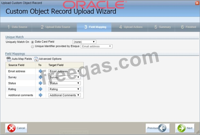 When adding new custom object records, you upload a CVS file and leave "Uniquely Match on" data card set to (none). What is the expected behavior? (Choose the best answer.)