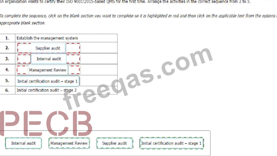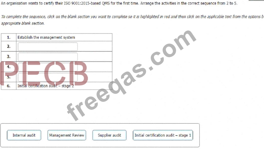 An organisation wants to certify their ISO 9001:2015-based QMS for the first time. Arrange the activities in the correct sequence from 2 to 5.