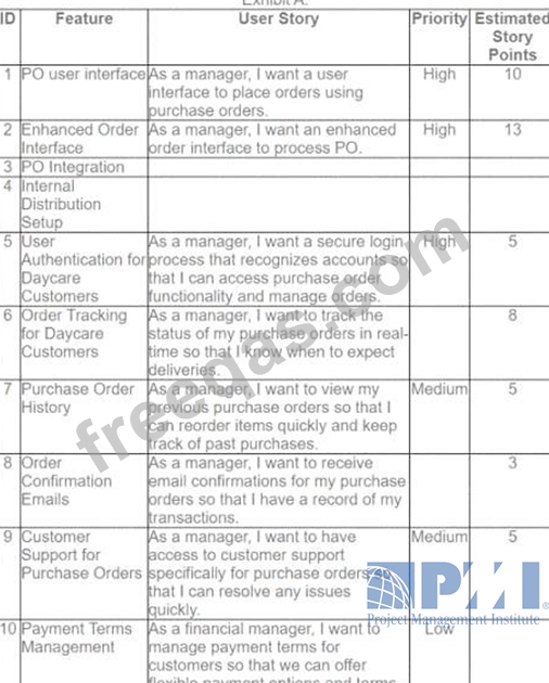 A food company seeks additional business-to-business (B2B) revenues from some customers by implementing purchase order (PO) functionality. To achieve this, the agile project team is exploring PO integration options (see item #3 in Exhibit A), as the product increment (PI) planning process is underway.