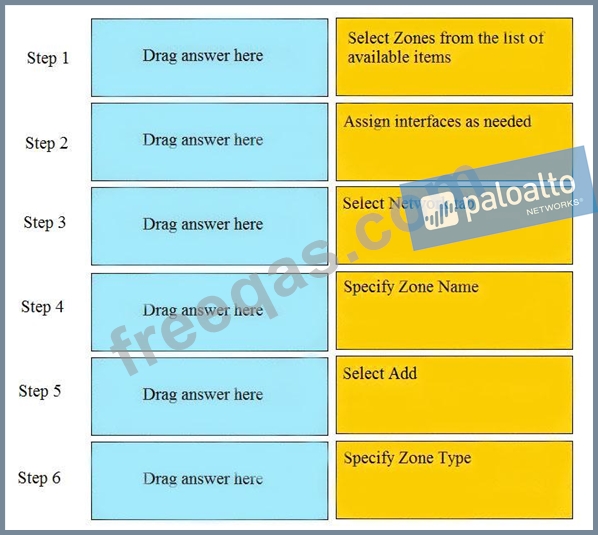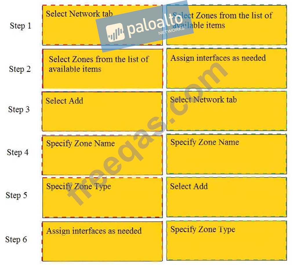 Order the steps needed to create a new security zone with a Palo Alto Networks firewall.