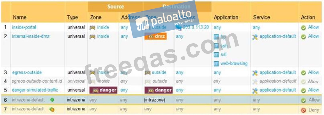 Based on the show security policy rule would match all FTP traffic from the inside zone to the outside zone?