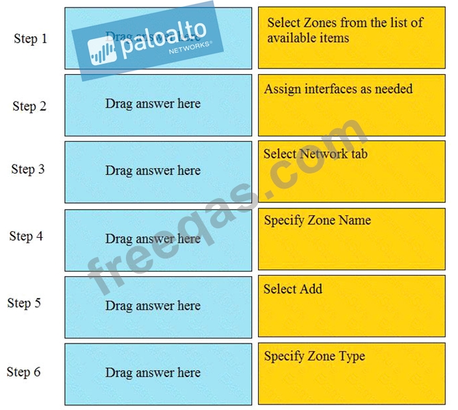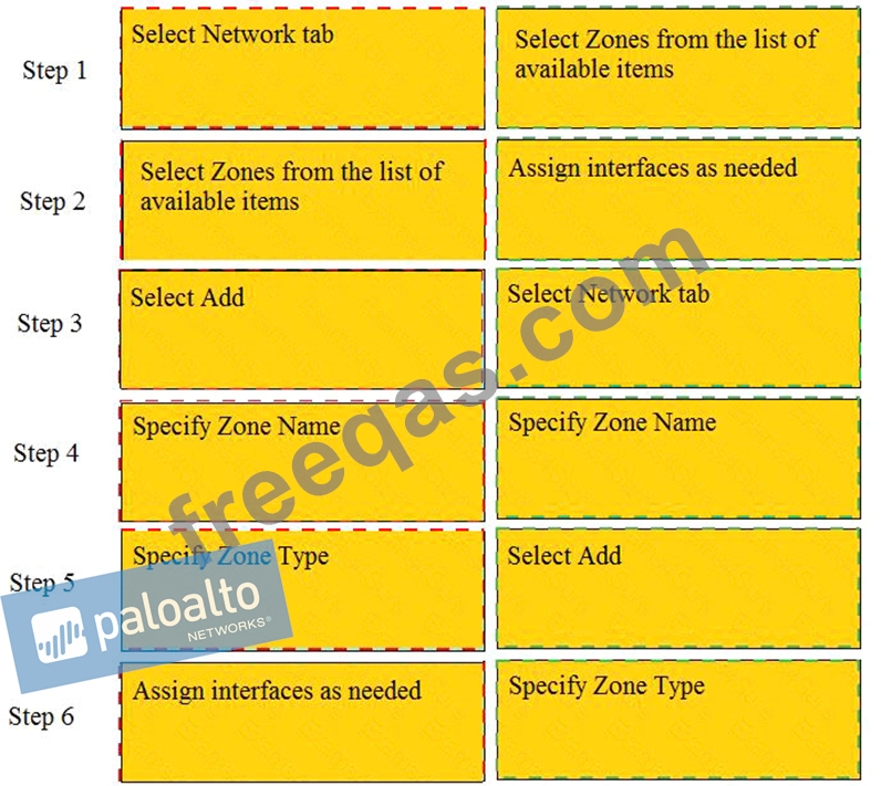 Order the steps needed to create a new security zone with a Palo Alto Networks firewall.