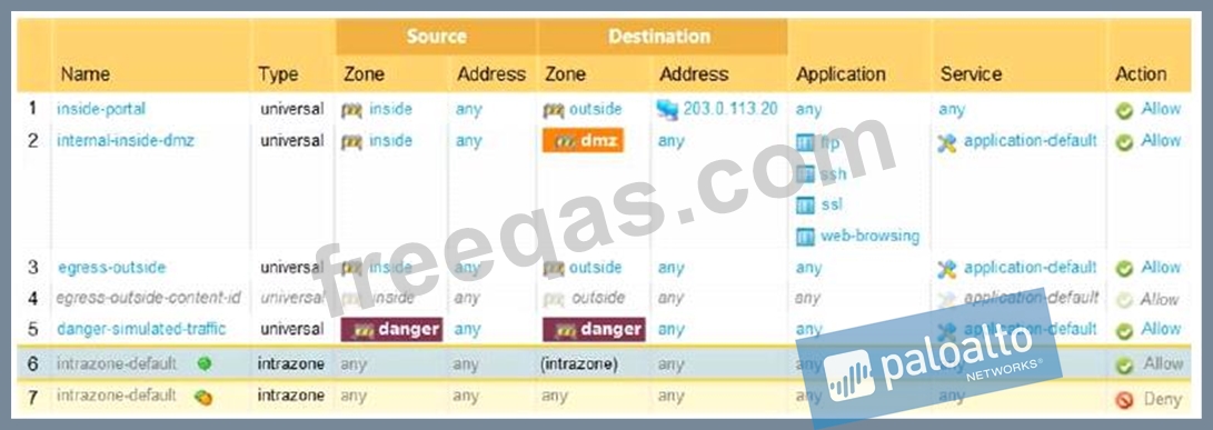 Based on the show security policy rule would match all FTP traffic from the inside zone to the outside zone?