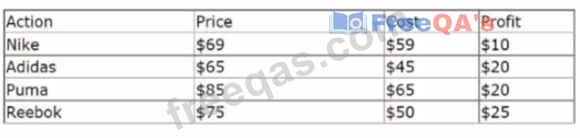 The following decision strategy outputs the most profitable shoe a retailer can sell. The profit is the selling Prices of the shoe, minus the Cost to acquire the shoe.