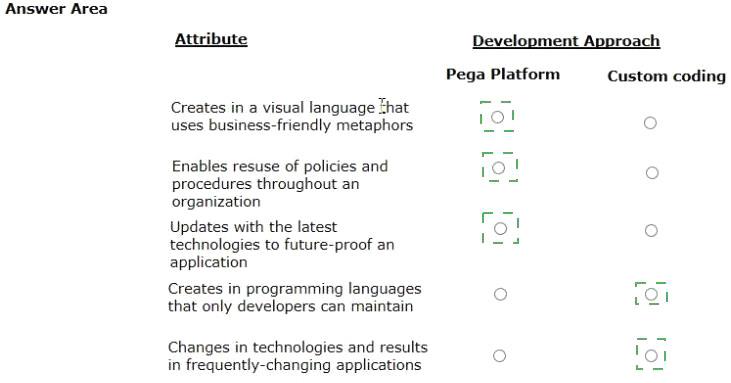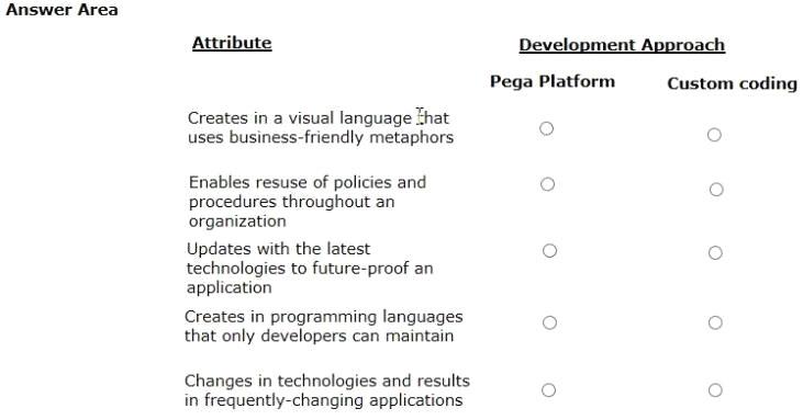 In the Answer Area, select the development approach that corresponds to each attribute.