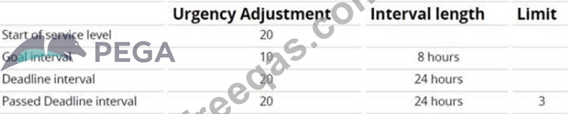 The service level provides a four-hour initial delay. If the case urgency is set to 10 and the case reaches the assignment at 9 A.M. Monday. what is the assignment urgency at noon Wednesday?