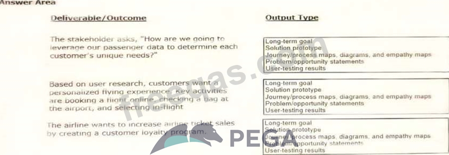 In the first design sprint, during the initial workshop with an airline, you obtain several deliverables and outcomes. In the Answer area, identify the output type for each deliverable or outcome.