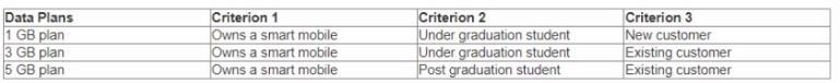 MyCo, a telecom company, developed a new data plan group to suit the needs of its customers The following table lists the three data plan actions and the criteria that customers must satisfy to qualify for the offer:
