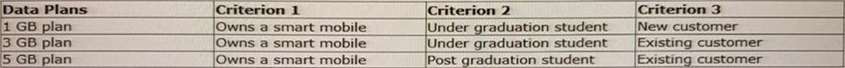 Myco, a telecom company, has come up with a new data plan group to suit its customers' needs. The below table lists the three data plan actions and the criteria a customer should satisfy to qualify for the offer.