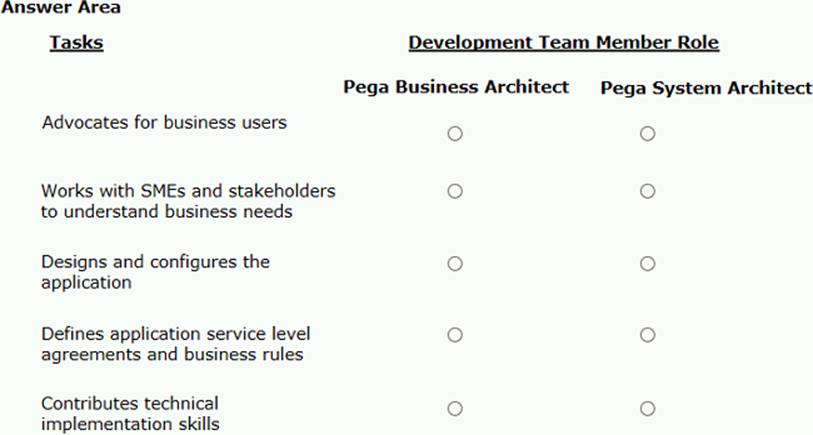 In the Answer Area, select the development team member that corresponds to each development task.