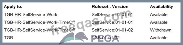 A rule with an Apply to: class of TGB-HR-SelfService-Work-TimeOff references a rule named ConfirmationRequest. The four instances of in the rules cache are shown in the following table.
