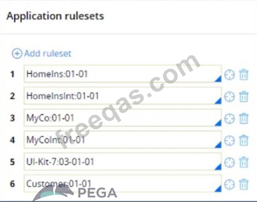 In the following example, the Homelns, Homelnslnt, and Customer rulesets are configured for application validation. MyCo and MyCoInt are configured for ruleset validation. MyCo lists MyCoInt and Customer as its prerequisites, and the prerequisite for MyCoInt is Pega-ProcessCommander.