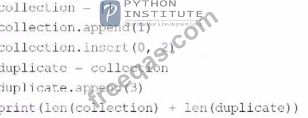 Explanation The code snippet that you have sent is trying to print the combined length of two lists, "collection" and "duplicate". The code is as follows: collection = [] collection.append(1) collection.insert(0, 2) duplicate = collection duplicate.append(3) print(len(collection) + len(duplicate)) The code starts with creating an empty list called "collection" and appending the number 1 to it. The list now contains [1]. Then, the code inserts the number 2 at the beginning of the list. The list now contains [2, 1]. Then, the code creates a new list called "duplicate" and assigns it the value of "collection". However, this does not create a copy of the list, but rather a reference to the same list object. Therefore, any changes made to "duplicate" will also affect "collection", and vice versa. Then, the code appends the number 3 to "duplicate". The list now contains [2, 1, 3], and so does "collection". Finally, the code tries to print the sum of the lengths of "collection" and "duplicate". However, this causes an exception, because the len function expects a single argument, not two. The code does not handle the exception, and therefore outputs nothing. The expected output of the code is nothing, because the code raises an exception and terminates. Therefore, the correct answer is D. The code raises an exception and outputs nothing.