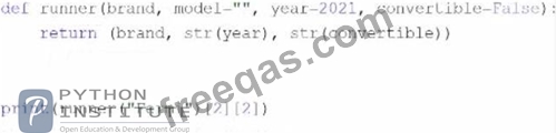Explanation The code snippet that you have sent is defining and calling a function in Python. The code is as follows: def runner(brand, model, year): return (brand, model, year) print(runner("Fermi")) The code starts with defining a function called "runner" with three parameters: "brand", "model", and "year". The function returns a tuple with the values of the parameters. A tuple is a data type in Python that can store multiple values in an ordered and immutable way. A tuple is created by using parentheses and separating the values with commas. For example, (1, 2, 3) is a tuple with three values. Then, the code calls the function "runner" with the value "Fermi" for the "brand" parameter and prints the result. However, the function expects three arguments, but only one is given. This will cause a TypeError exception, which is an error that occurs when a function or operation receives an argument that has the wrong type or number. The code does not handle the exception, and therefore it will terminate with an error message. However, if the code had handled the exception, or if the function had used default values for the missing parameters, the expected output of the code would be ('Fermi ', '2021', 'False'). This is because the function returns a tuple with the values of the parameters, and the print function displays the tuple to the screen. Therefore, the correct answer is D. ('Fermi ', '2021', 'False').