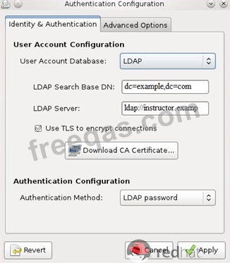 The base DN for the authentication service is dc=domain11, dc=example, dc=com LDAP is used to provide both account information and authentication information. The connection should be encrypted using the certificate at http://host.domain11.example.com/pub/domain11.crt When properly configured, ldapuserX should be able to log into your system, but will not have a home directory until you have completed the autofs requirement. Username: ldapuser11 Password: password
