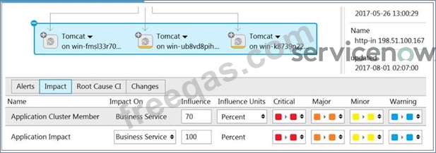 Given the following Impact settings and Alerts in a three node cluster that makes up the components of a Business Service, what is the overall service health of this Business Service?