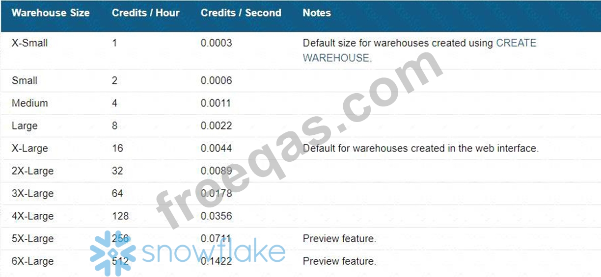 In Snowflake, each size increase in virtual warehouses doubles the number of servers. Therefore, if a size Small virtual warehouse is made up of two servers, a Large warehouse, which is two sizes larger, would be made up of eight servers (2 servers for Small, 4 for Medium, and 8 for Large)2. Size specifies the amount of compute resources available per cluster in a warehouse. Snowflake supports the following warehouse sizes: https://docs.snowflake.com/en/user-guide/warehouses-overview.html