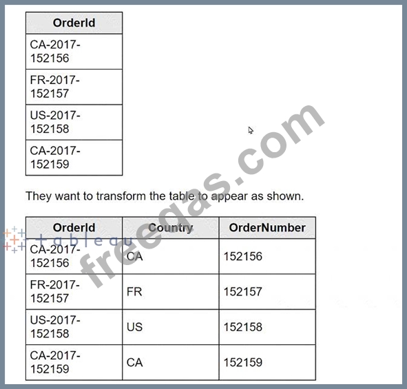 A client is working in Tableau Prep and has a field named Orderld that is compiled by country, year, and an order number as shown in the following table.