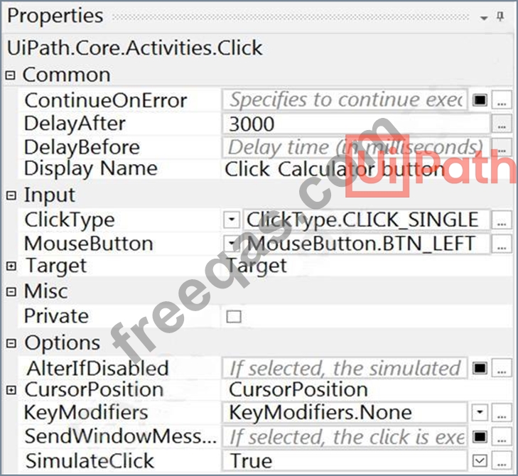 A developer uses Workflow Analyzer with the default rules to check if a project follows best practices. In one of the workflows, the Properties of a Click activity is shown in the following exhibit.