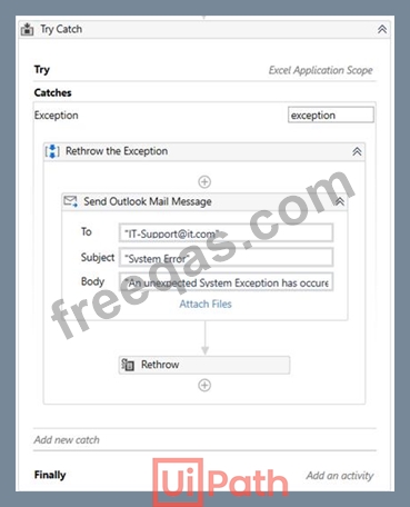 Rethrow activity is used when additional activities need to be added before the exception is thrown. You cannot specify the type of error to be thrown. Instead, you place Rethrow activity in the Catch handler of a TryCatch, and the type of the error is the same as the type of the previously caught error. Please note, that the Finally block is not executed if the error was rethrown. Example: Before an unexpected System Exception is thrown, the error is caught in TryCatch activity, a mail message is sent to the IT support team, and then the error is rethrown to end the execution. Exam Topic: Identify and describe the use of the error handling activities such as Try Catch, Throw, Rethrow, Retry Scope, and Global Exception Handler