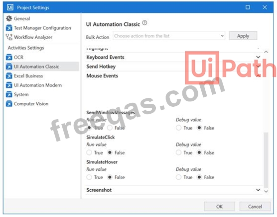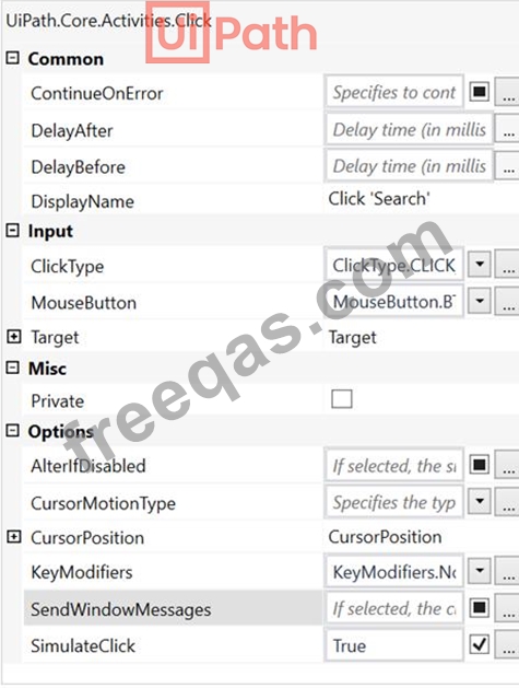 A developer has configured the Activity Project Settings for UI automation and a Click activity as shown below. What will be the result of executing the Click activity in Run mode?